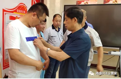 老黨員為新黨員佩戴黨徽,鼓勵(lì)年輕人不斷拼搏